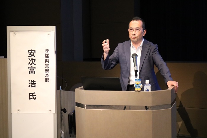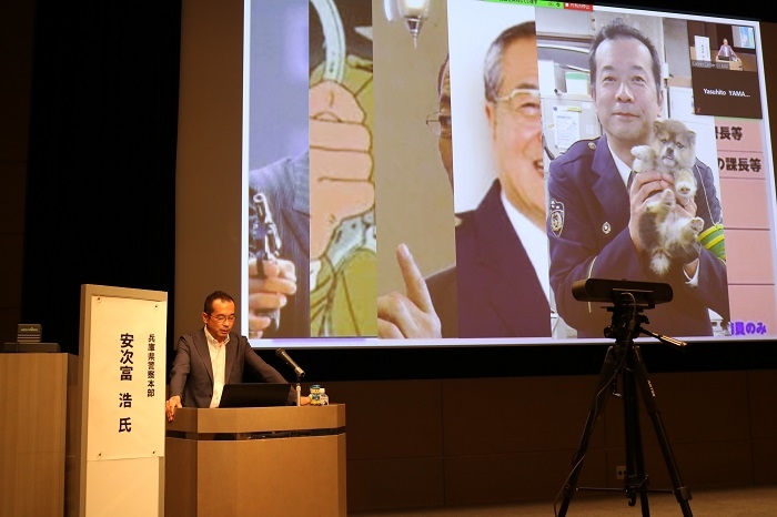 安次富さんは1988年に卒業。現在、兵庫県警国際捜査課の課長補佐として外国人や外国とかかわる捜査の最前線で活躍中です。講演では外大時代から現在に至る軌跡をたどり、「自分流の生き方」を紹介しました。