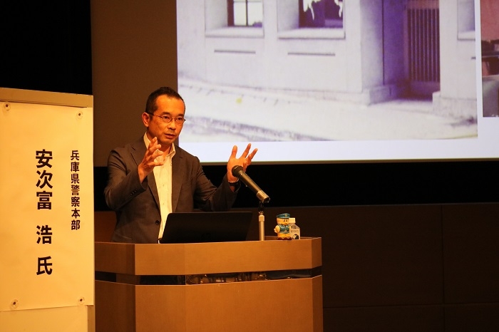 卒業後の7年間は、大手ゼネコン、スペインの現地法人、神戸の日本料理店店長、マドリッドの和食店マネジャー、兵庫の食品会社の営業マンと1~2年ごとに転職。29歳で兵庫県警の警察官になりました。「辛いことがいろいろとあって、1~2年で辞めるかもしれないと思っていましたが、刑事の仕事にどんどんのめり込んでいきました」と話しました。