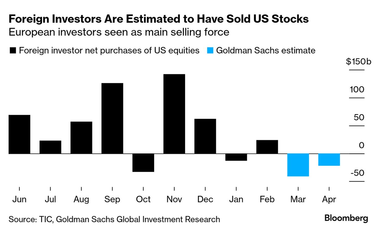 米ゴールドマン・サックスのストラテジストの推計によれば、3月初め以降に外国人投資家は米国株を630億ドル(約9兆円)相当売却したもようだ。ハイフリークエンシー(高頻度)の資金フローに関するデータでは、この売却を主導しているのは欧州の投資家であり、他の地域では米国株を引き続き買い越していることが示唆されるという。