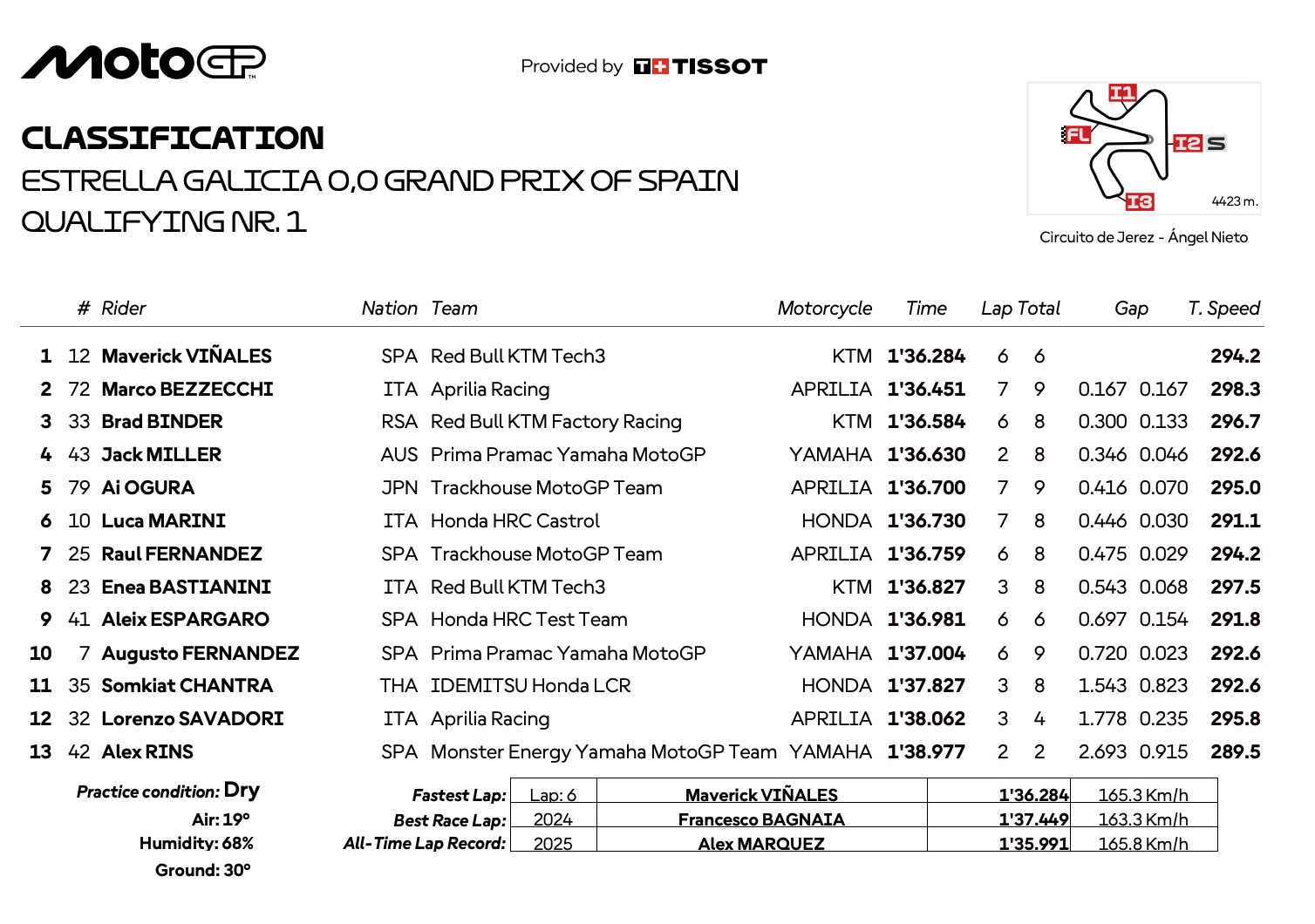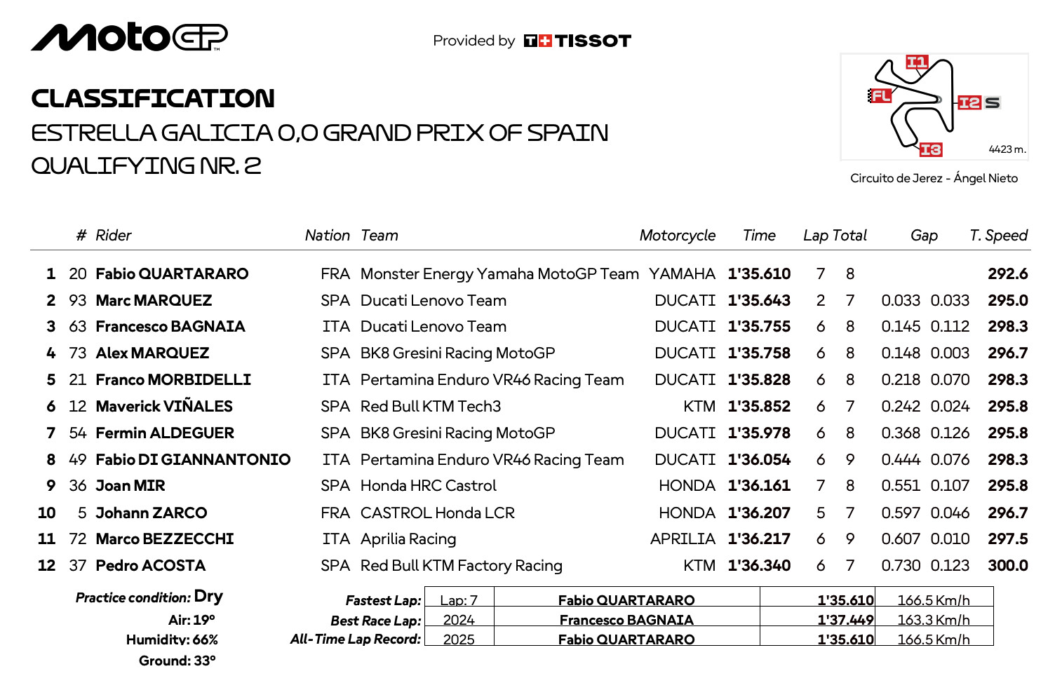順位ゼッケンライダー名メーカータイム最高速度1位20ファビオ・クアルタラロYAMAHA1’35.610292.6km/h2位93マルク・マルケスDUCATI1’35.643295km/h3位63フランチェスコ・バニャイアDUCATI1’35.755298.3km/h4位73アレックス・マルケスDUCATI1’35.758296.7km/h5位21フランコ・モルビデッリDUCATI1’35.828298.3km/h6位12マーべリック・ビニャーレスKTM1’35.852295.8km/h7位54フェルミン・アルデゲルDUCATI1’35.978295.8km/h8位49ファビオ・ディ・ジャンアントニオDUCATI1’36.054298.3km/h9位36ジョアン・ミルHONDA1’36.161295.8km/h10位5ヨハン・ザルコHONDA1’36.207296.7km/h11位72マルコ・ベッツェッキAPRILIA1’36.217297.5km/h12位37ペドロ・アコスタKTM1’36.340300km/h