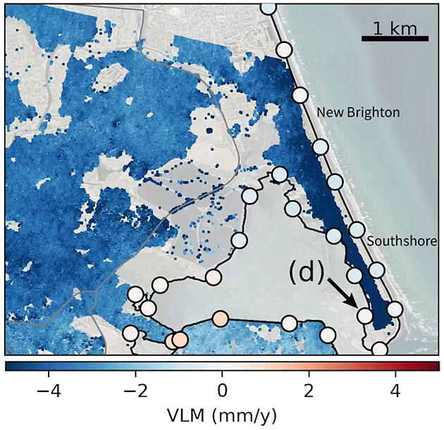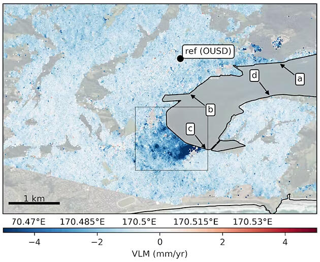 ダニーデンにおける陸地の垂直移動(VLM)の地図。濃い青色は年間4mm以上の割合で土地が沈下している部分である。