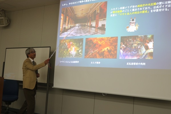 初谷教授はメキシコ史が専門で、マヤ人の歴史研究の第一人者です。メキシコ南東部のユカタン半島にはマヤ語を話すマヤ人が100万人住んでいます。マヤ人の大反乱といわれた「カスタ戦争」(1847~1901年)は、メキシコ史上最大の先住民の反乱でした。初谷教授は、スペイン人の征服からカスタ戦争を経て現在に至るまでのマヤ人の抵抗の歴史について話しました。