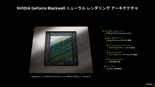 さらに詳しい「NVIDIA GeForce Blackwell ニューラル レンダリング アーキテクチャ」の解説も行われました。まずは第5世代Tensorコアによって1,800 AI TOPSを実現したことから始まり、レイトレーシング面ではMega Geometryに対応した第4世代RTコアが活躍すること。AI管理プロセッサー(AI Management Processor)によるAIとグラフィックを同時に実行するためのスケジューリングに、シェーダーコア「Blackwell SM」でニューラルシェーダー(AI と従来のレンダリングを合わせたグラフィック生成技術)を構築などが挙げられました。わかりやすいところとしては28Gbpsで世界最速であるG7メモリの存在もあります。