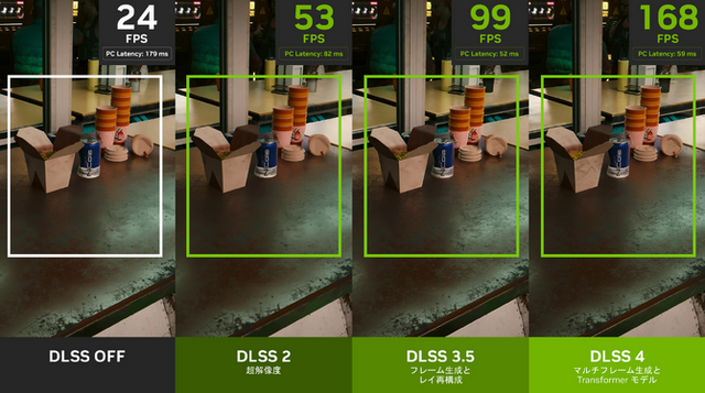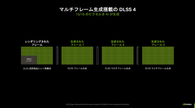 解像度の向上を行うDLSS2、フレーム生成とレイ再構築のDLSS3.5に続く「DLSS4」はマルチフレーム生成およびTransformerモデル導入が特徴です。「NVIDIA Blackwell アーキテクチャ」はこれに最適化されており、DLSS4はなんとグラフィックの16分の15をAIが生成してくれるとのこと。DLSS3.5と比べてもフレームレートが1.7倍となっています。