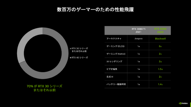 そして、現在シェアの70%がRTX30シリーズ以前のものを使用している現状を踏まえ、RTX3080 TiとRTX5090の比較も公開されます。DLSSを使用したスペック面では、なんと6倍の性能を発揮するとのこと! 3Dレンダリングでは2倍、バッテリー駆動時間では1.4倍と、“性能が上がったから消費電力が上がる”わけではなく、総合的に進化していることが改めて説明されました。