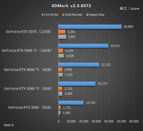 これはグレード別、世代別にキレイに分かれた。RTX 5060 TiはRTX 5070に対して27%~50%のスコアダウンと基本性能には大きな差が見える。