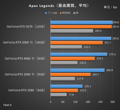 Apex Legendsはフレームレート上限のあるタイプのゲームで、最大300fpsで頭打ちになる。RTX 5070はWQHDまでほぼ上限に達しているが、RTX 5060 Tiだと上限に達するのはフルHDだけだ。このゲームは描画負荷がそれほど高くないので最高画質でも旧世代GPUで十分プレイができる。