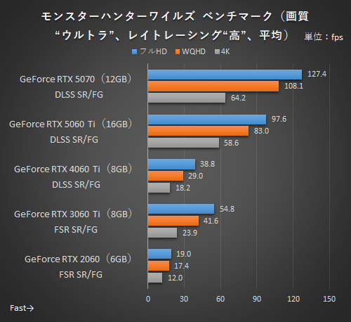 その一方でモンスターハンターワイルズの最高画質設定は描画負荷が強烈に高い。4Kで平均60fpsをクリアできるのはRTX 5070だけだ。GPUの処理能力に加え、ビデオメモリ量が重要となるゲームではあるが、残念ながらビデオメモリ容量の多いRTX 5060 TiでもRTX 5070は上回れなかった。