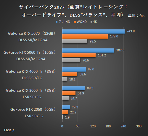 RTX 5070とRTX 5060 Tiの性能差は3DMarkと同じ傾向だ。20~40%ほどRTX 5070のフレームレートが高くなる。その一方でマルチフレーム生成の威力は高く、旧世代GPUとの差は大きく開いた。