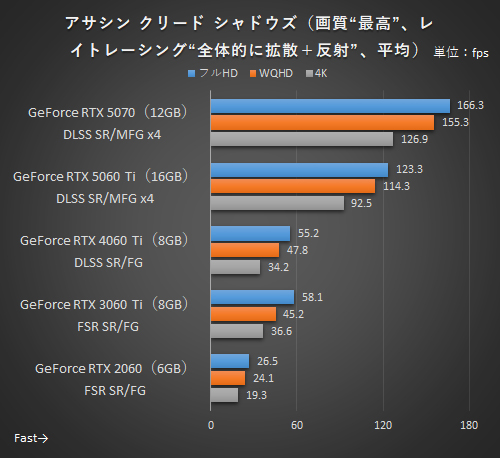 サイバーパンク2077のフレームレートの計測結果アサシン クリード シャドウズのフレームレートの計測結果