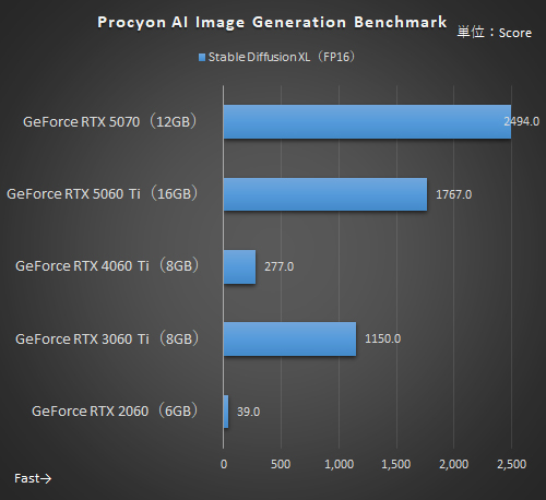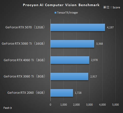 Procyon AI Computer Vision Benchmarkはグレード別、世代別に分かれた順当な結果になった。Procyon AI Image Generation BenchmarkもRTX 5070とRTX 5060 Tiの差は順当と言えるが、RTX 4060 TiよりもRTX 3060 Tiのほうが圧倒的にスコアが高いのはちょっと意外だった。おそらくRTX 3060 Tiのほうがメモリバス幅とメモリ帯域幅が広いためだろう。