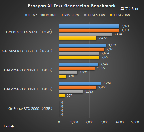 注目はProcyon AI Text Generation Benchmarkのテストでもっともパラメーター数が多くなる「Llama-2-13B」だ。RTX 5060 TiがRTX 5070のスコアを上回った。メモリバス幅で劣るRTX 5060 Tiが勝利しているのは16GBのビデオメモリ量が効いているのだろう。そしてビデオメモリが6GBのRTX 2060は動作すらできなかった。