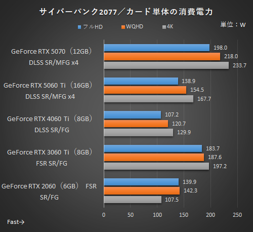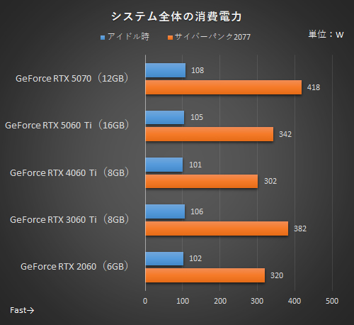 カード単体で見るとRTX 5060 Tiの消費電力はRTX 5070よりも60Wほど低くなる。フレームレートの差を考慮しても、RTX 5060 Tiのワットパフォーマンスは良好と言ってよいだろう。その一方で、RTX 3060 Tiの消費電力の大きさが目立つところだ。システム全体の消費電力も同じ傾向だ。RTX 40シリーズは電力効率のよさで知られているが、今回の結果からもそれが見える。