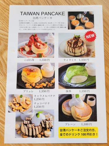 メニューは、定番のプレーンやチョコバナナ、ティラミス、抹茶など。その他、期間限定のパンケーキもあります。※こぼれ苺は期間限定のメニューとなっています。