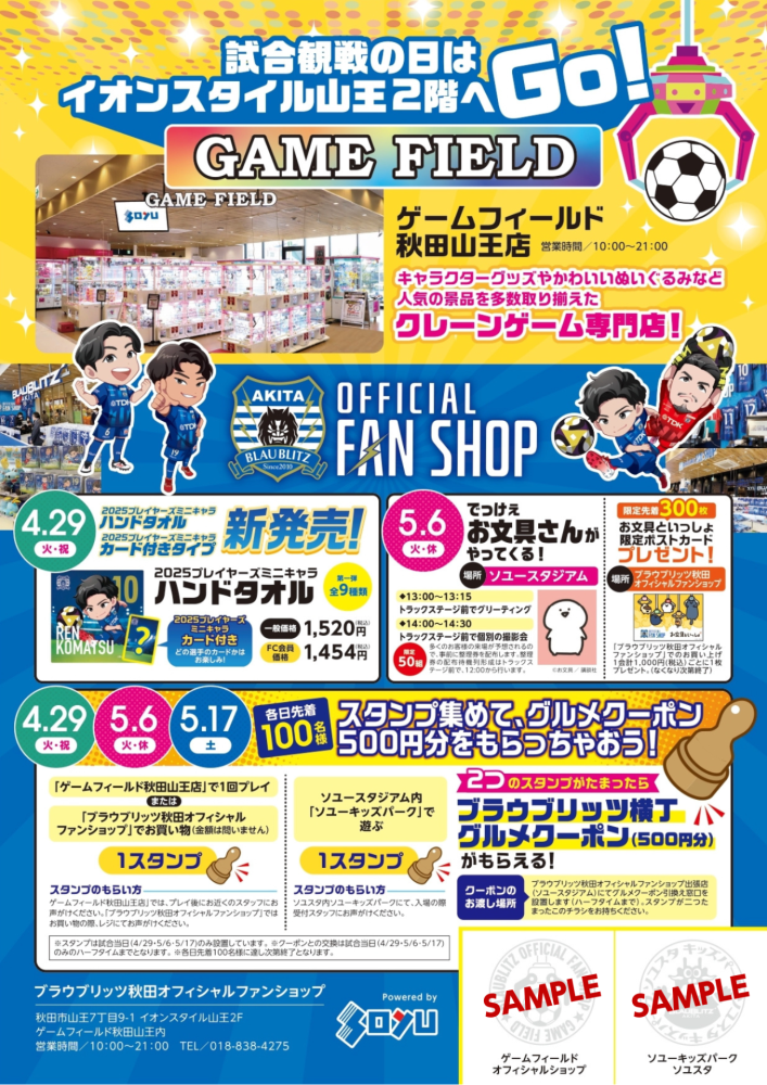 ①イオンスタイル山王 2階「ゲームフィールド秋田山王店」で1回プレイ or 「ブラウブリッツ秋田オフィシャルファンショップ」でお買い物(※お会計金額は問いません)