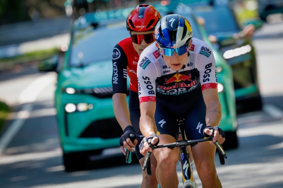 この日最後のマンモルスハイン(距離2.3km/平均勾配8.3%)に入ると、地元ドイツ出身のマキシミリアン・シャフマン(スーダル・クイックステップ)がアタック。それにアンドレアス・レックネスン(ノルウェー、ウノエックス・モビリティ)とグレゴール・ミュールベルガー(オーストリア、モビスター)が追従。しかし残り18km地点で捉まり、その後もアタックが続いたものの、決め手に欠いたため集団スプリントに持ち込まれた。
