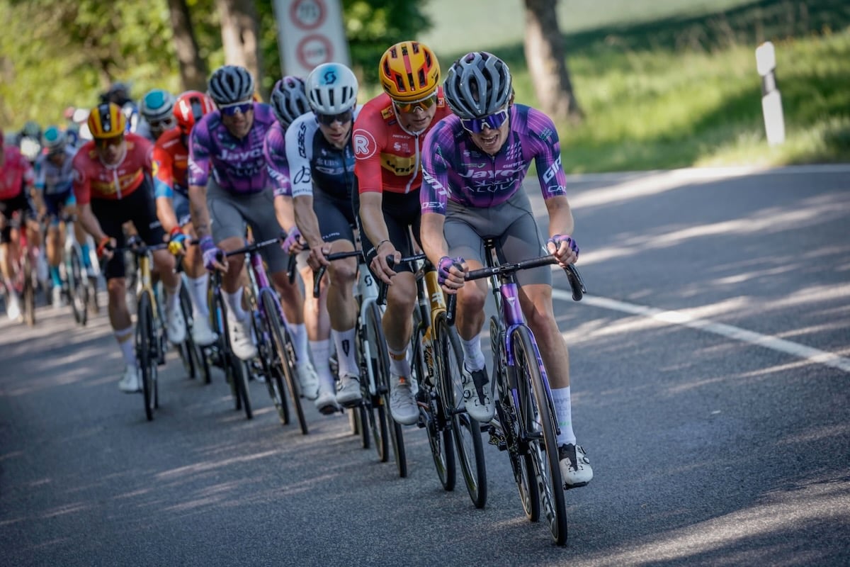 「労働の日」のため祝日であるドイツの気温は26度と高く、集団で走る選手たちはストッキングに入れた氷を背中に入れ、何度もボトルを交換しながら体温の上昇を防ぐ。プロトンの先頭ではジェイコが相変わらずペースを作り、またマグナス・コルト(デンマーク)を擁するウノエックス・モビリティも高速牽引で人数を絞っていく。