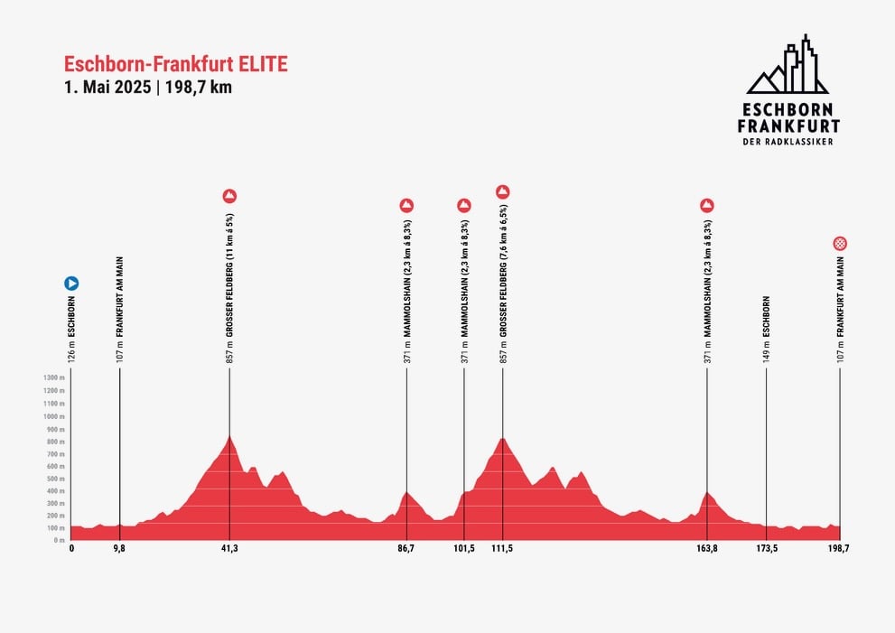 エシュボルン・フランクフルト2025 コースプロフィール image:Eschborn-Frankfurt1962年に初開催され、ドイツ最古のワンデーレースであるのがエシュボルン・フランクフルト(UCIワールドツアー)だ。発着地点はその名の通り、エシュボルンからフランクフルトまでの198.7km。フェルトベルクを2度(登るルートはそれぞれ異なる)、そしてマンモルスハイン(距離2.3km/平均勾配8.3%)を3度登坂するレイアウトで、最後のマンモルスハイン頂上からは、約40kmの下りと平坦路がフィニッシュまで続いていく。