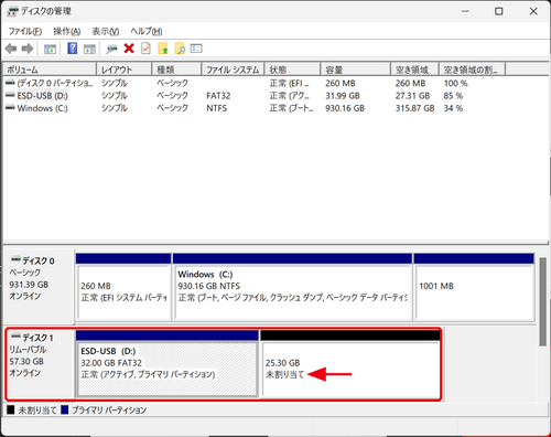 64GBのUSBメモリでは全容量のうち32GBがFAT32でフォーマットされインストールメディアに。残りの領域は未割り当て