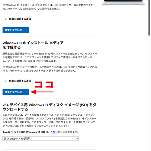 真ん中の「Windows 11のインストールメディアを作成する」内にある「今すぐダウンロード」を選びます