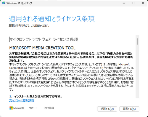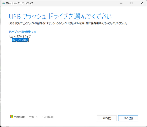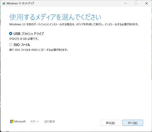 ダウンロードした「Windows 11 メディア作成ツール」(mediacreationtool.exe)を起動します「適用される通知とライセンス条項の確認」画面でライセンス条項を確認し「同意する」を選びます言語(日本語)、エディション(Windows 11)を確認して「次へ」を押します「使用するメディアを選んでください」画面で「USB フラッシュドライブ」を選択して「次へ」「USBフラッシュドライブを選んでください」画面でインストールするUSBドライブを選択して「次へ」をクリック。USBドライブの選択を間違えるとデータが消えてしまうので、「D:」など、接続したUSBメモリのドライブレターが正しいかどうか十分確認しましょう