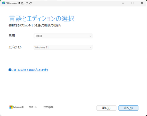 1つ目は使用中のPCにWindows 11をインストールするためのオプションなので今回のような場合には使用しません。3つ目「Windows 11 ディスク イメージ (ISO)」はISOファイルをダウンロードできます。ISO形式はDVDに書き込んでインストールメディアとして利用できるほか、カスタマイズされたインストールメディアを作成する際にも利用します。なお、「Windows 11 メディア作成ツール」でもISOファイル形式のインストールメディアが作成可能です。