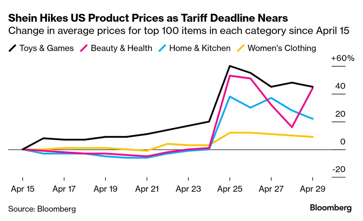 シーインでも、4月29日時点で「玩具・ゲーム」「美容・ヘルスケア」の2大カテゴリーで人気上位100商品の平均価格が2週間前と比べ40%余り上昇。家庭用品は20%強、女性用衣料も9%値上がりしている。