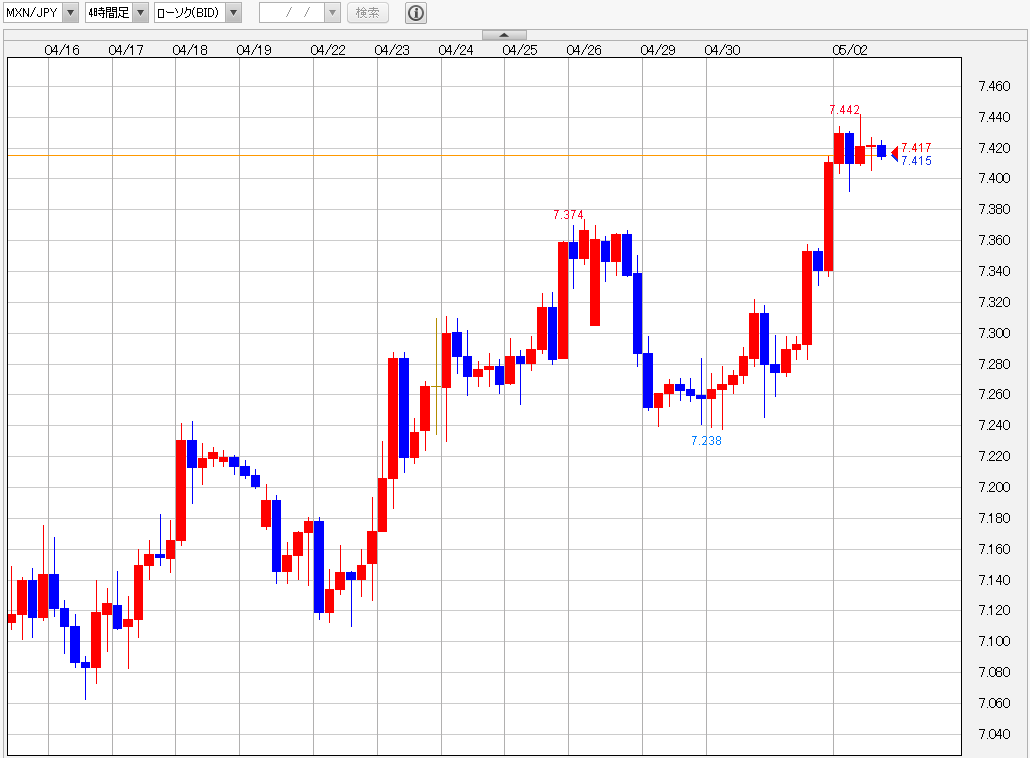 米中貿易戦争に緩和の兆しが見られる中、市場のリスク回避姿勢が後退。NYダウ平均は5月1日にかけて8連騰を記録しました。そうした中でペソ/円は7.2円台を下値に強含みで推移。4月28日から30日にかけては7.3円台の上値が重かったものの、月が替わった5月1日には一気に7.4円台を回復。2日の東京市場では3月28日以来の高値となる7.442円前後まで上値を伸ばす場面もありました。なお、この間30日に発表されたメキシコ1-3月期国内総生産(GDP)は前期比+0.2%と市場予想(+0.1%)を上回り、10-12月期(-0.6%)に続いてのマイナス成長を回避しました。