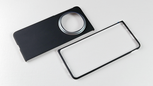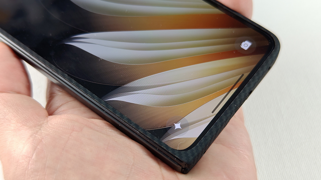 カバーディスプレイ側も本来は内側の両面テープで貼り付ける構造なのですが、テープ無しでもしっかりはまり簡単には外れません。アラミド繊維ケースは作りが固めなのでヒンジ側の薄いベゼル部分も簡単に曲がったりしないのです。これが透明樹脂製ケースだと簡単に曲がってしまうのです(結果、折れる)。