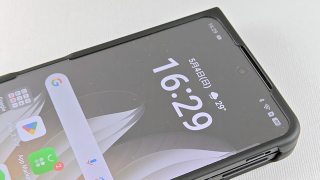 このケース、ヒンジ部分もカバーするのですが、背面側しかないんですよね。まあ、机の上に置いたり手で握っているときに傷がつきやすいのは背面側かもしれませんが、表が丸出しなのも心配です。せっかく付けてくれるのなら表面もと思いますが、OPPOとしては、それはサードパーティー製でという考えなのでしょうか。