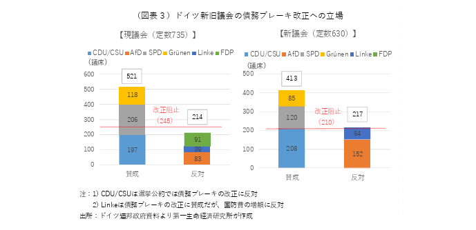更なる債務ブレーキの改正や柔軟適用も視野に入れるが、新議会の下で憲法改正に必要な3分の2以上の賛成が得られるかは微妙な情勢で、国防費やインフラ投資以外の財政拡張の行方は予断を許さない。