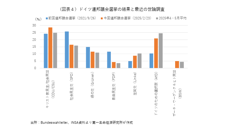 連立政権外でも新政権を取り巻く政治環境は極めて不透明だ。2月の連邦議会選挙後の世論調査では、第一党となったCDU・CSUが大きく支持を落とすなか、第二党に躍進したAfDが一段と支持を伸ばし、両党の支持率が逆転しているものも珍しくない。