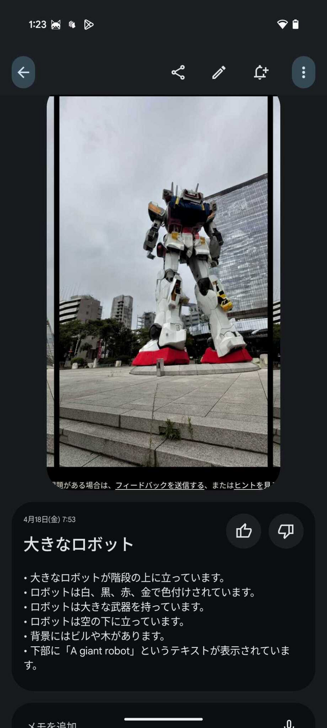 Pixelスクリーンショットがどう違うのかといえば、たとえば「巨大なロボットが夜のビル街に立っている」「巨大なロボットは手に大きな武器を構えている」「巨大なロボットの足元にいる人々」のように、より踏み込んだ分析をテキストで持っていること。スクリーンショットを撮ったアプリもアイコンで分かりやすく分類されています。