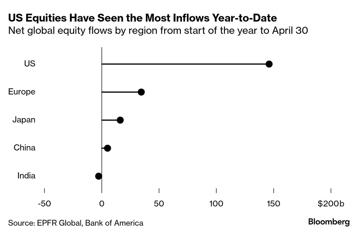 BofAがまとめたEPFRのデータによると、4月30日までの3週間で欧州株へは34億ドル(約4850億円)が流入、米国株からは89億ドルが引き揚げられた。しかしネットベースでは、今年に入って米国株への資金流入が約1463億ドルと最も多く、欧州の約4倍余りとなっている。