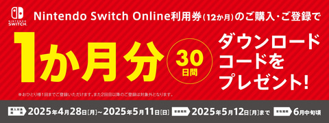 本キャンペーンは、「Nintendo Switch Online利用券(12か月券)」を購入し、特設サイトから登録すると、もれなく「Nintendo Switch Online 1か月(30日間)利用コード」がもらえるというもの。購入対象期間は本日5月11日23時59分まで。登録締切は5月12日23時59分までで、5月12日に購入した商品は対象とならない。