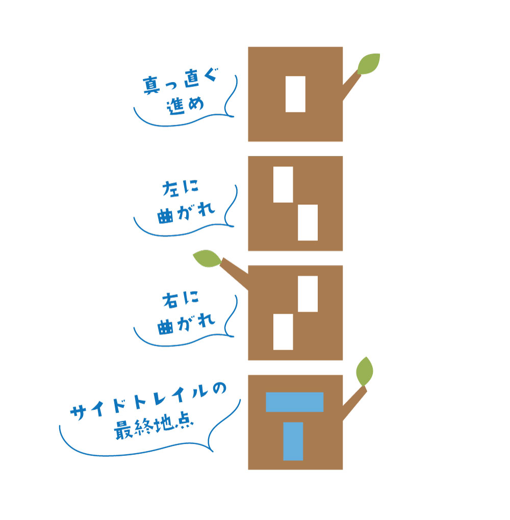 木や岩に白く塗られている長方形の印はメイン・トレイルを意味し、その色が青い場合はサイド・トレイルを示している。長方形が一つだけなら「真っ直ぐ進め」、二つ左右にあるうちの左側が上の場合「左に曲がれ」、そして右側が上の場合「右に進め」を指している。サイド・トレイルの場合アルファベットの「T」の形に長方形が示されている場合、それはそのトレイルの最終地点という意味がある。