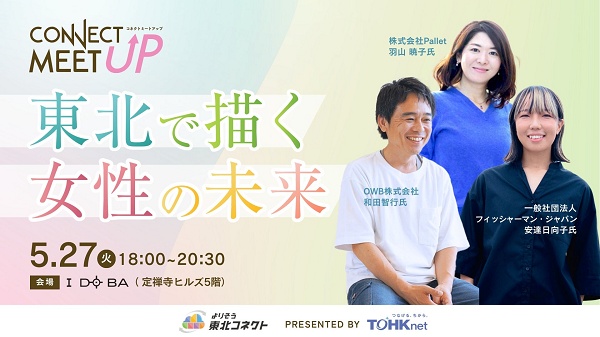東北電力グループのトークネットは、5月27日(火)に宮城県仙台市内の定禅寺ヒルズ5階 IDOBAにて、2024年に開催された「CONNECT MEET UP -東北で描く女性の未来-」に続く第2弾の企画として、対面のリアルイベント「CONNECT MEET UP -東北で描く女性の未来-」を開催する。