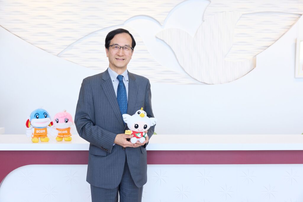 本部のHATOC(ハトック)でイメージキャラクターの「はとっぴー」を手にする平松社長。今年秋に滋賀県で開催される「第79回国民スポーツ大会・第24回全国障害者スポーツ大会」ではJAPAN GAMESパートナー、オフィシャルサプライヤーとして協賛する(左側後ろにあるのは大会マスコットキャラクター)など地域との取り組みを深掘りしている