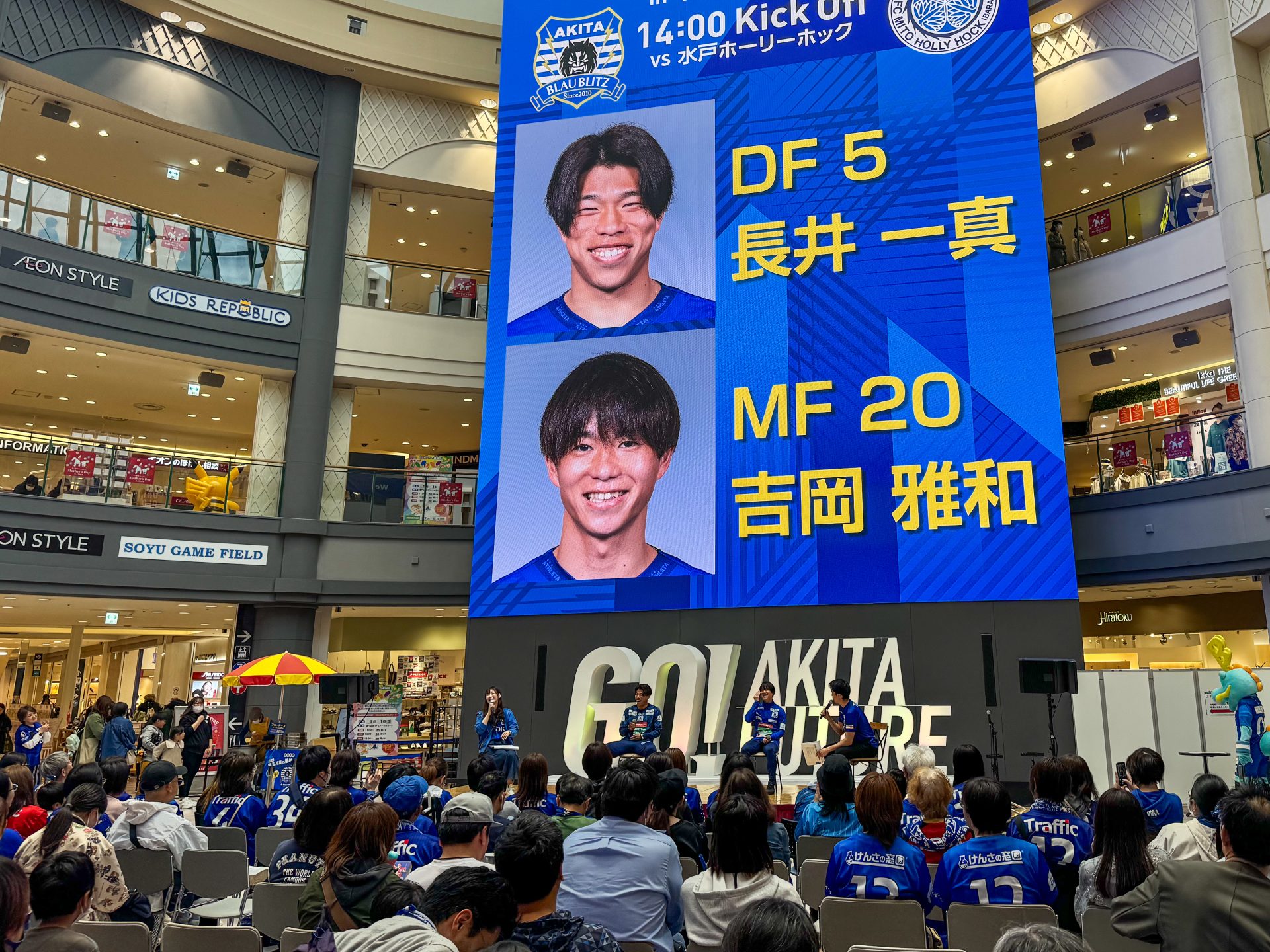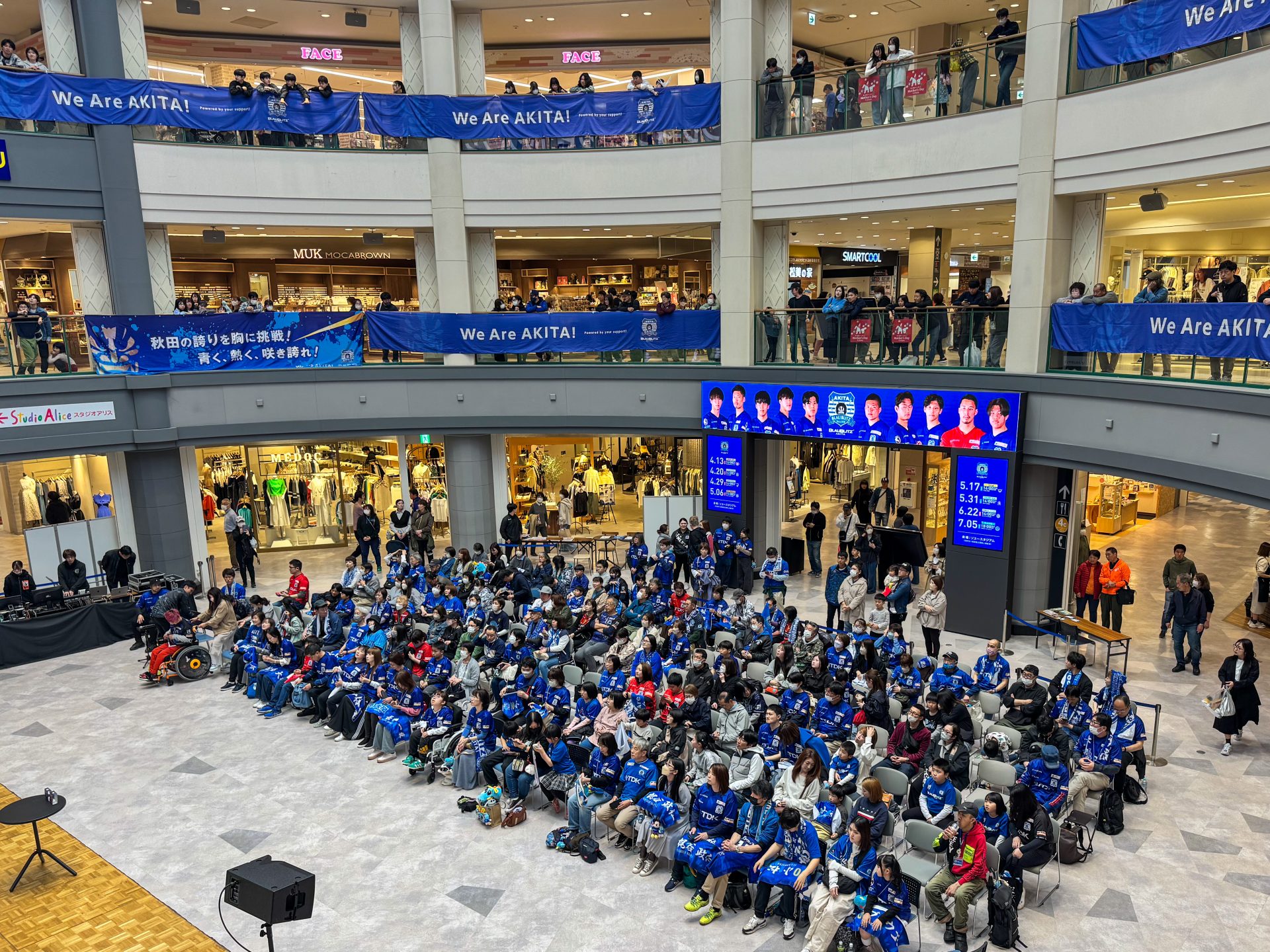 5月11日(日)、イオンモール秋田 セントラルコートにて「2025明治安田J2リーグ第15節 ブラウブリッツ秋田 vs 水戸ホーリーホック」のパブリックビューイングを実施しました。