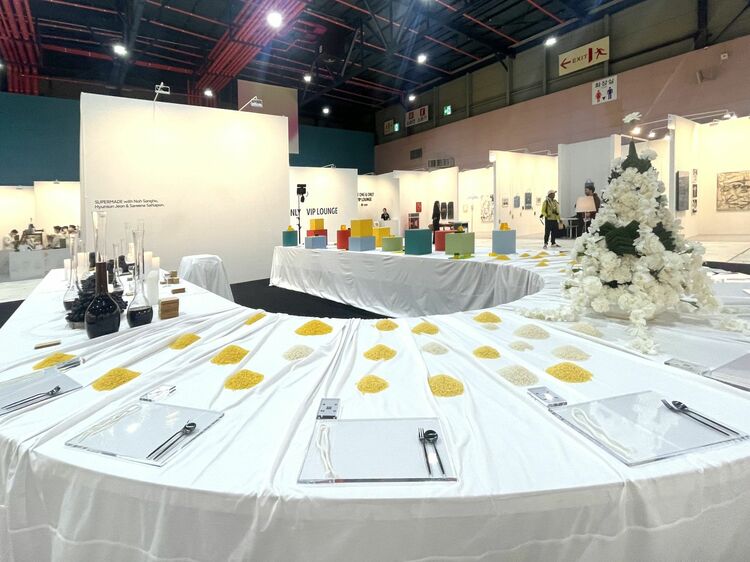 会場で、さっそくユニークな光景が目に入った。大きなテーブルが設置され、マルチジャンルアーティストチーム「SUPERMADE」の、食の体験作品だ。相席した観客同士を結びつけ、食の記憶、コミュニティ感覚に誘う。こんな作品は、拝金主義的なアートフェアにはない。