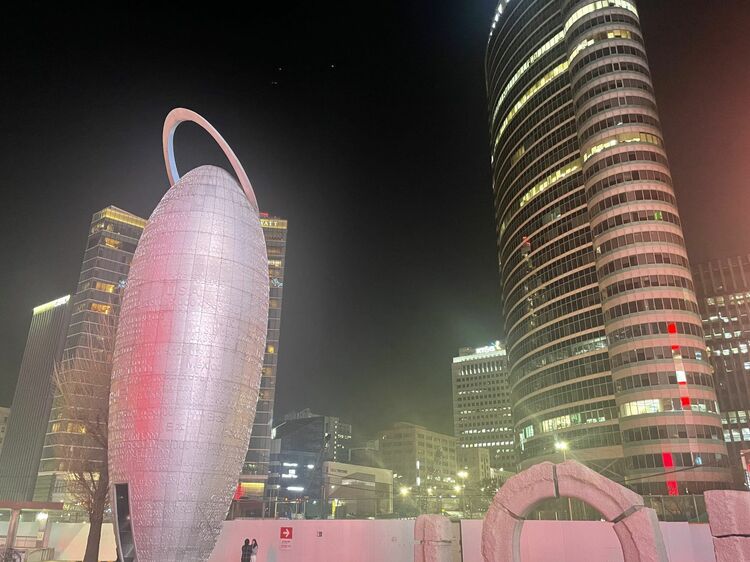 ソウル、地下鉄サムスン駅近くのパブリックアート。近未来的なビル群のデザインに似合う