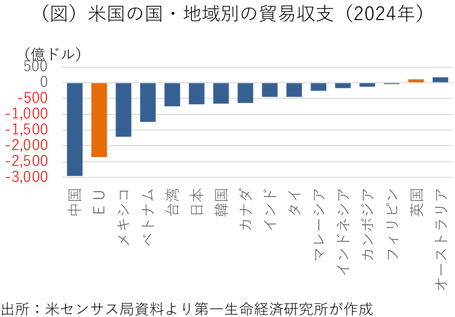 EUの米国向け輸出品目の上位には、医薬品、自動車、化学品、航空機、医療機器、エンジンなどが並ぶ。トランプ大統領が自動車とともに問題視するのが医薬品だ。トランプ大統領は12日、米国の医薬品が諸外国と比べて割高であるとして、薬価を最大90%引き下げるための大統領令に署名した。今後30日以内に製薬会社に価格目標を提示し、6ヶ月以内に顕著な進展がみられなければ、追加措置を講じる。国外で製造された薬も対象となり、引き下げに応じない国に対しては追加関税を導入する可能性も示唆している。