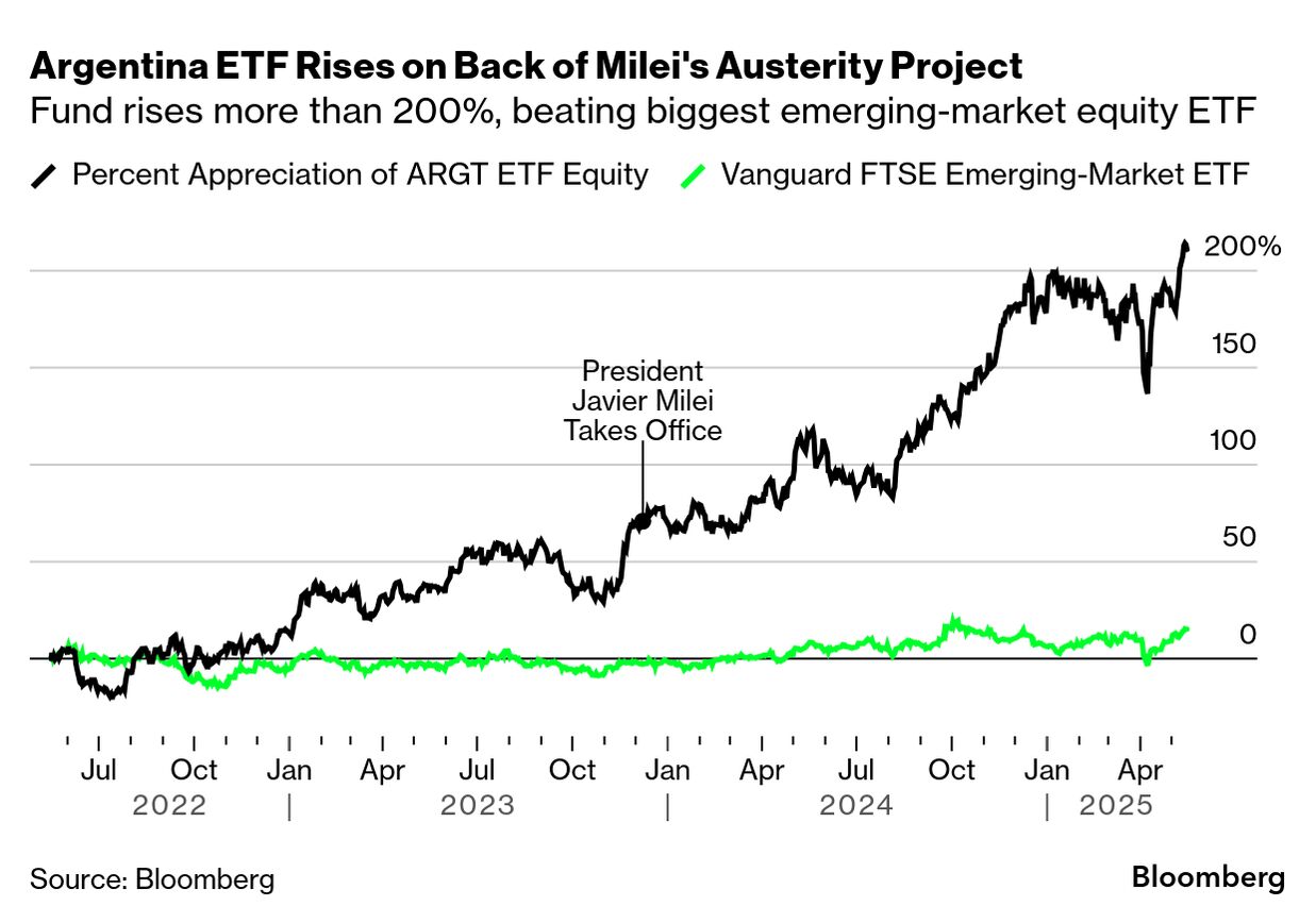 このアルゼンチンETFは、ここ2年間で2倍余り上昇し、新興国市場の他のETFを上回るパフォーマンスを示している。背景には、ミレイ大統領が南米2位のアルゼンチン経済の立て直しに成功するとの期待感がある。また、他のアルゼンチン資産では、ドル建て国債が昨年、新興国市場で最も好調な投資対象の一つだった。投資家がアルゼンチン国債を保有する際に求める上乗せ利回りは大幅に低下した。