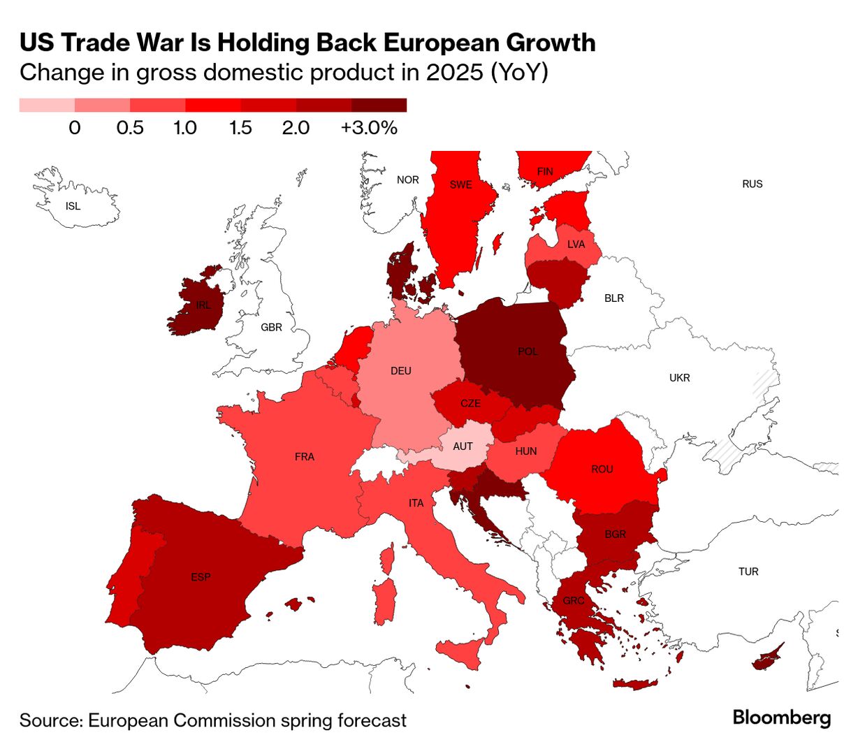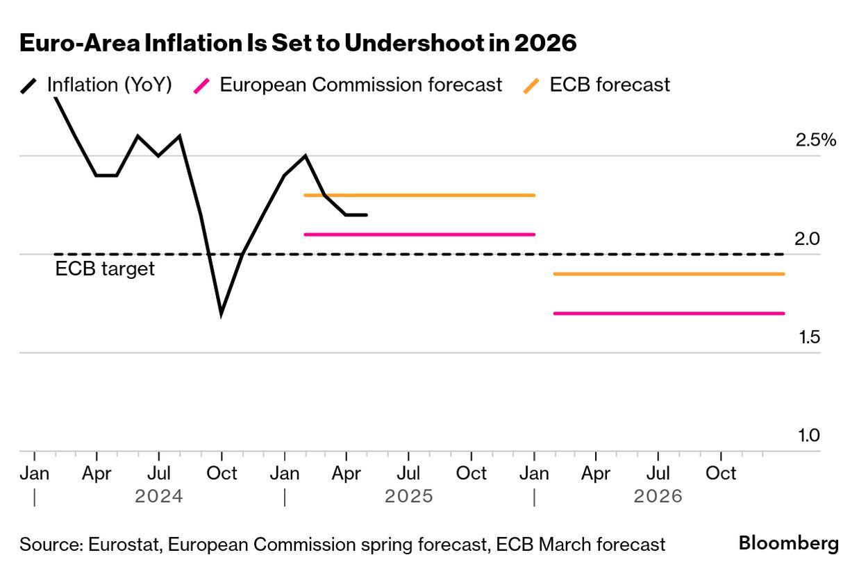ECBは6月5日に次回の政策判断と合わせ、スタッフによる四半期経済見通しを発表する。米国の関税が物価に下押し圧力をかけるとの見方を政策委員会メンバーの多くが示しており、この会合では追加利下げが見込まれている。