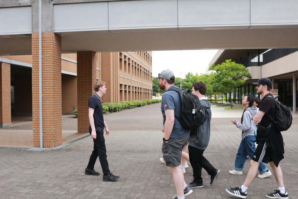 キャンパスツアーでは、食堂や円形ステージなど中宮キャンパスを一周しました。「日本庭園があったり、食堂やコンビニエンスストアもあり、勉強とリフレッシュができるキャンパスですね」とツアーを楽しみました。