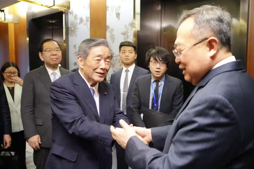 中国共産党中央対外連絡部の劉建超部長(右端)と握手する日中友好議員連盟の森山裕会長=4月28日、北京(代表撮影・共同)