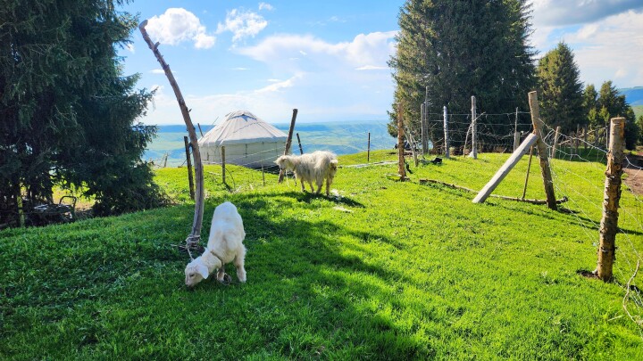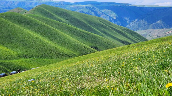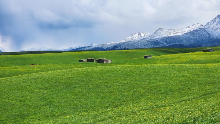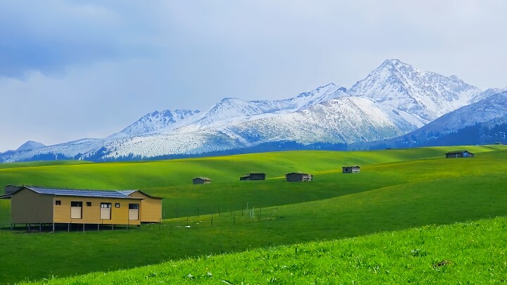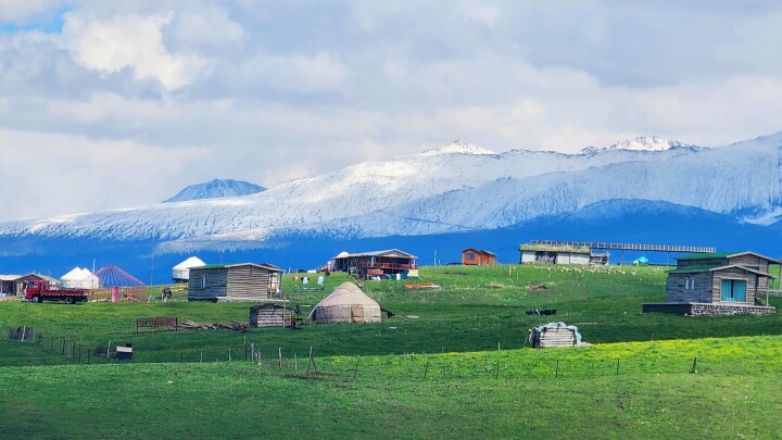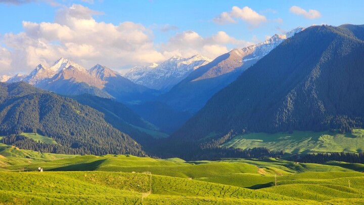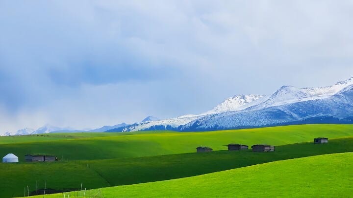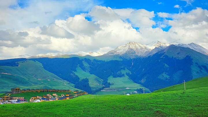 瓊庫什台村は、新疆ウイグル自治区イリ・カザフ自治州、天山山脈の奥深くにある村だ。そこに向けて車で出発すると、まるで流れる絵画展に足を踏み入れたような道が続く。窓の外には山々が連なり、S字やZ字に曲がる道は大自然が無造作に描いた曲線のようだ。草原には馬や牛、羊が自由に散らばり、遠くにそびえる真っ白な雪山、深緑色の木々、白いテント型の家、そして青い空と相まって壮麗で調和の取れた田園風景を織り成している。