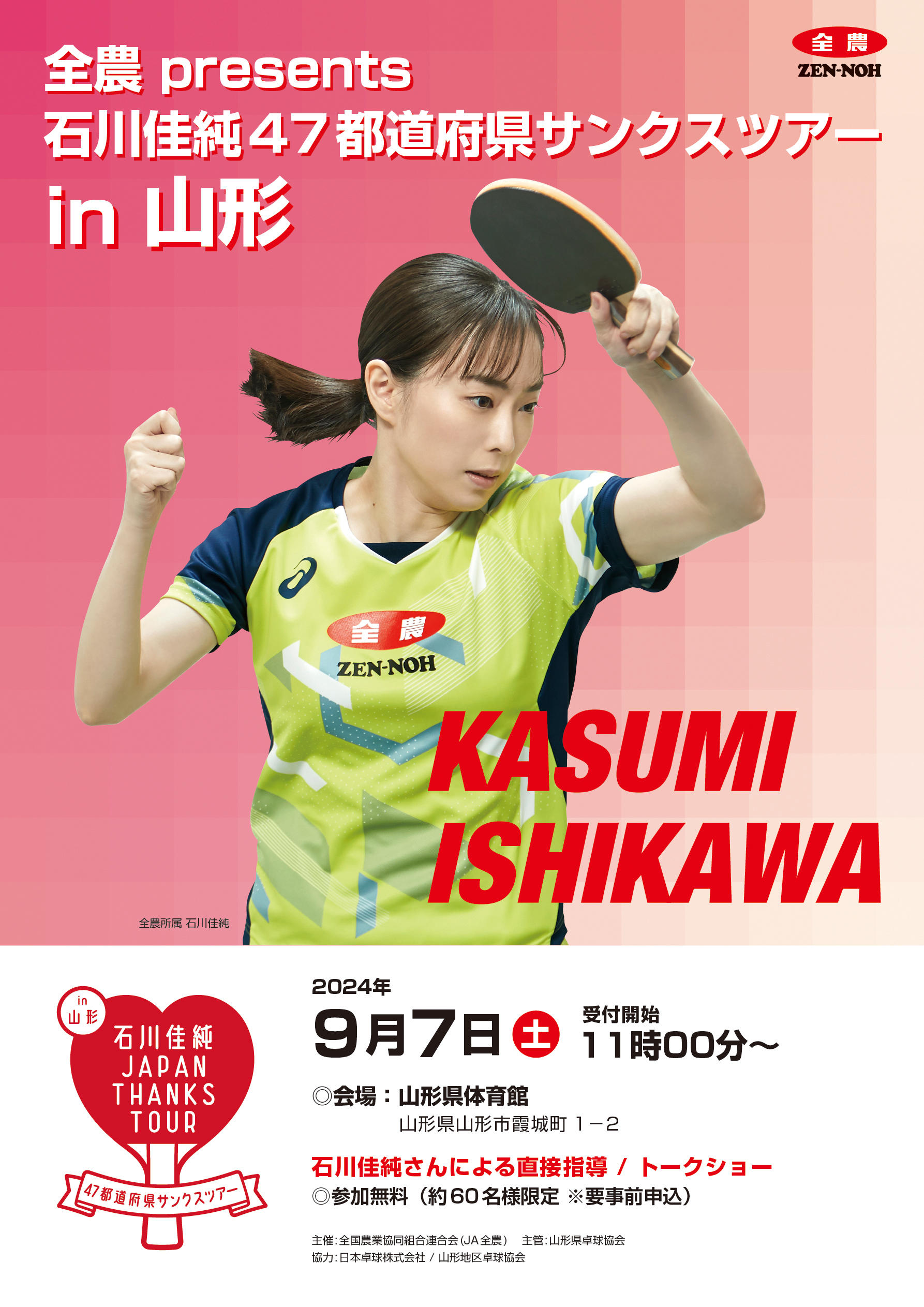 JA全農は、9月7日(土)に山形県山形市・山形県体育館にて、全農所属で元卓球日本代表の石川佳純さんによる卓球教室「全農presents石川佳純47都道府県サンクスツアーin山形」を開催します。全農主催としては、5月25日に開催の新潟県に続き今年4回目となります。