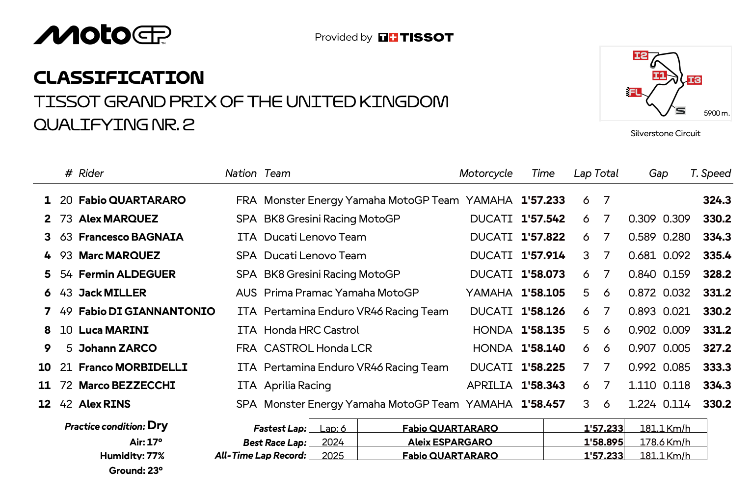 この記録は、2番手のアレックス・マルケス(BK8グレシーニ・レーシングMotoGP)に0.309秒差をつける圧倒的なパフォーマンスだった。3番手にはフランチェスコ・バニャイア(ドゥカティ・レノボ・チーム)が入り、フロントローを確保した。一方、チャンピオンシップ首位を走るマルク・マルケス(ドゥカティ・レノボ・チーム)は4番手で2列目スタートとなる。