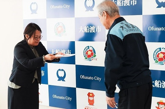 大船渡市の渕上清市長(写真右)へ、当社 理事執行役員 東北カンパニー プレジデント 兼 東北商品部長の坂本眞規子より目録を贈呈